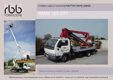 CORSO ABILITAZIONE PIATTAFORME AEREE SNAKE 18.9 CITY - Massime prestazioni, semplicità di utilizzo, affidabilità. RBB Formazione. Corsi Piattaforme Aeree, Milano tel: 02.36563675, Torino tel: 011.4240549. mail: info@rbbformazione.it